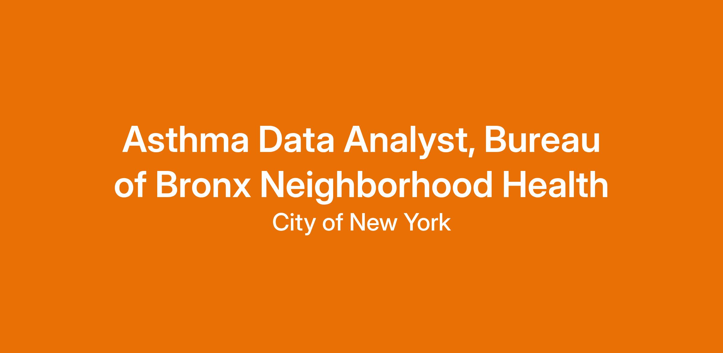 The Bureau of Bronx Neighborhood Health seeks to hire a Asthma Program Analyst who will be responsible for the day-to-day management of data collection and analysis.