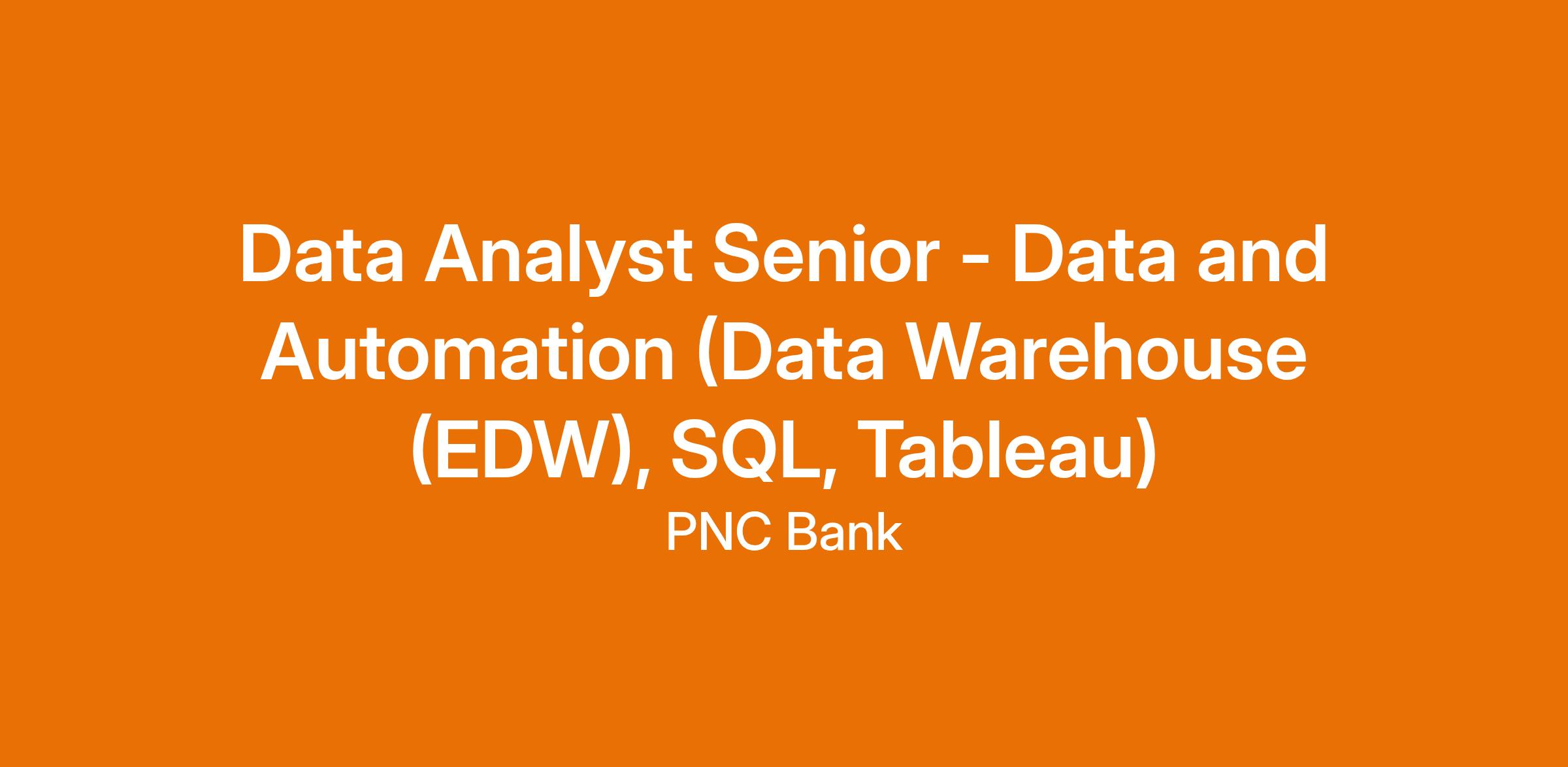 At PNC, our people are our greatest differentiator and competitive advantage in the markets we serve. We are all united in delivering the best experience for our customers. We work together each day to foster an inclusive workplace culture where all of our employees feel respected, valued and have an opportunity to contribute to the company’s success. As a Senior Data Analyst within PNC's Data and Automation organization, you will be based in either Pittsburgh-PA, Strongsville-OH or Denver-CO.